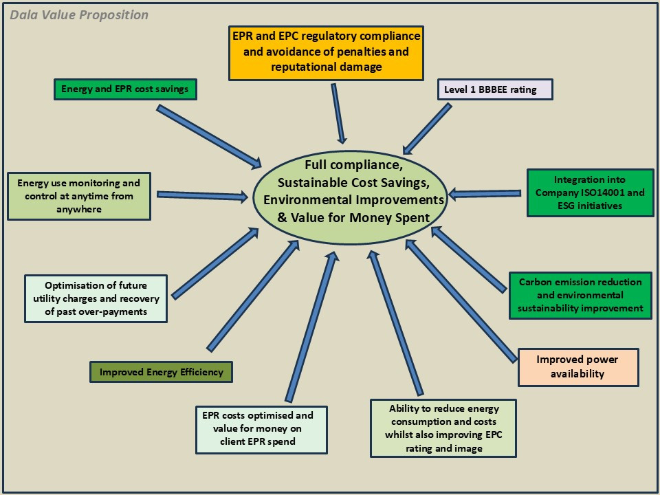 The goal of Dala is to assist clients to reduce their energy costs and carbon emissions, improve their energy security, and to comply with EPR and EPC regulations that seek to improve environmental sustainability. Dala assists to resolve utility bill issues (handling of disputes, identify and recover over-charges, optimise tariffs used for billing, represent client with utility provider, etc), implement energy monitoring systems to manage and optimise usage and costs, and manage on behalf of clients solar pv and battery storage projects to reduce costs and emissions, and to improve the security of supply. Dala assists with regularising and complying with Extended Producer Responsibility (EPR) Regulations for the Electrical and Electronic Equipment (EEE) and Lighting sectors, and to reduce or optimise the costs thereof. Dala is authorised to conduct energy performance assessments and issue Energy Performance Certificates (EPC) for buildings that meet the compliance thresholds of the EPC regulations. Dala's focus is on achieving sustainable savings, compliance and value for money for clients. Dala assists clients to manage and report on their environmental ESG initiatives.